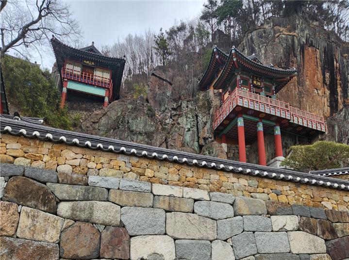 그렇게 땀방울이 조금 맺힐 즈음, 갑자기 시야가 확 트이면서 암자가 눈앞에 나타났습니다. 절벽 끝에 아슬아슬하게 걸려 있는 듯한 건물은 그 자체로 압도적이었습니다. 순간 “사람이 어떻게 이런 곳에 건물을 지었을까?”라는 의문과 함께 경이로움이 몰려왔습니다. 남도여행 중에도 이렇게 특별한 첫인상을 남기는 장소는 드물다는 생각이 들었어요.